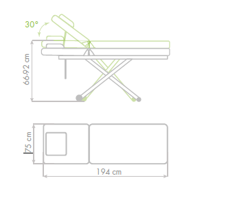 La camilla tiene 2 partes. La parte del respaldo es más alto que cualquiera camilla de masaje, que permite al cliente estar en posición sentado o medio sentado. Inclinación del respaldo es manual.